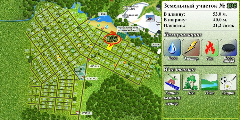 Коммуникации: электричество (8Квт), вода, канализация, газовые коммуникации (подведены на каждый участок, ожидается подключение к магистрали)